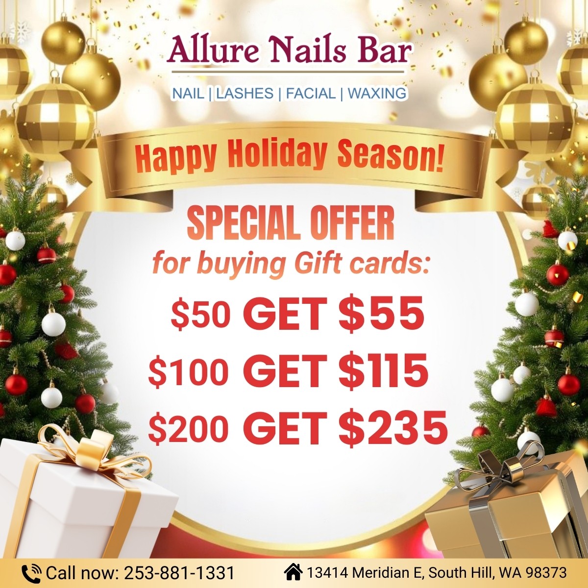 Let’s visit, have a relaxing time, and become prettier after enjoying high-end services at one of the best Nails Salons in South Hill: Allure Nails Bar. Conveniently located in South Hill, WA 98373, our nail salon is proud to deliver the highest quality treatments to our customers. Our goal is to make your visit to our nail salon an experience, which enhances your life and wellbeing for years to come.